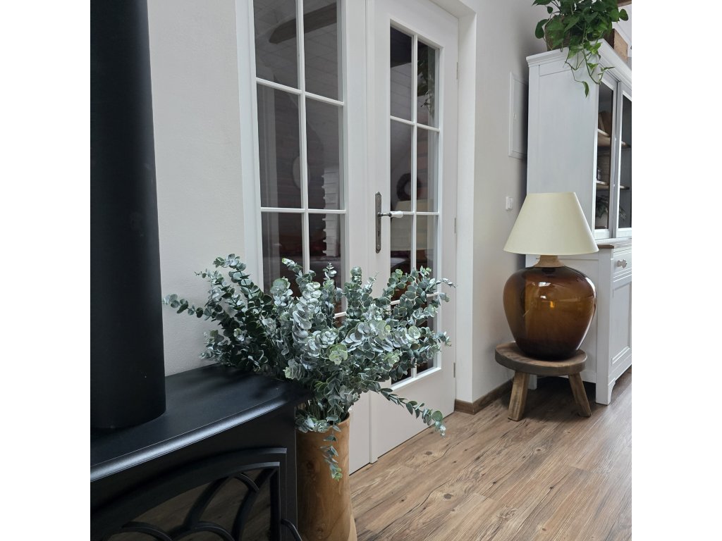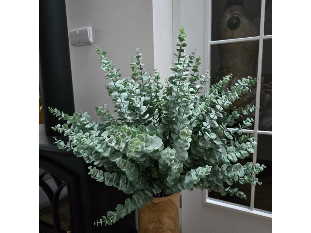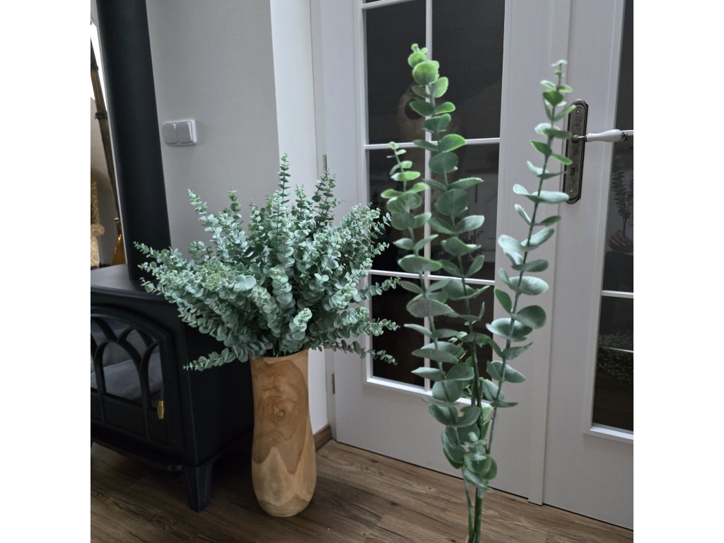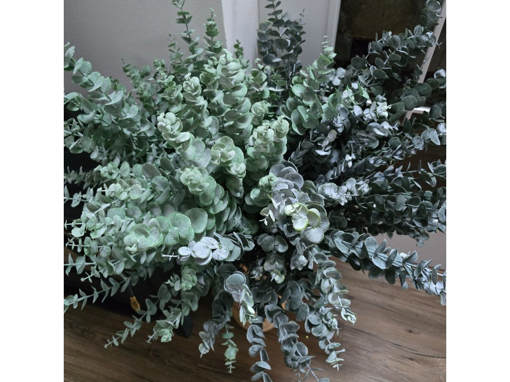 Umělá větev Eukalyptu s práškováním. Naprosto skvěle a věrohodně připomíná Eukalypt živý. Ve váze i v dekoraci krásně vynikne. L