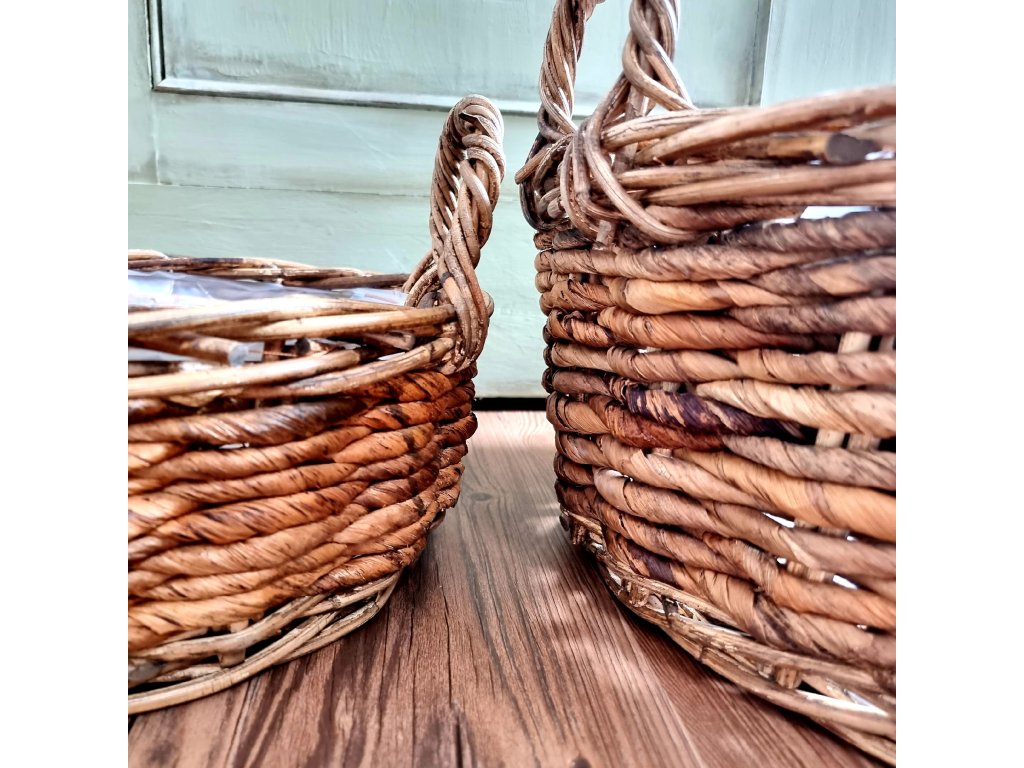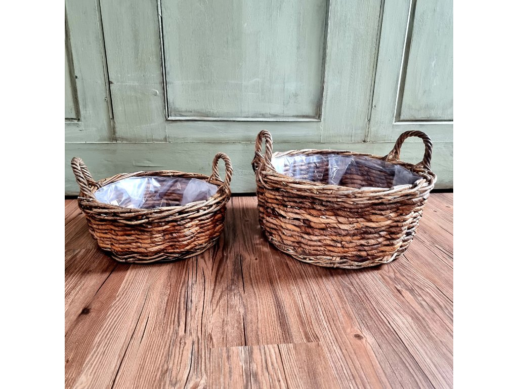 Koš s uchy a igelitovou výplní, vyrobený z banánových listů. Vynikne po celou sezónu, jak v interiéru, tak exteriéru.