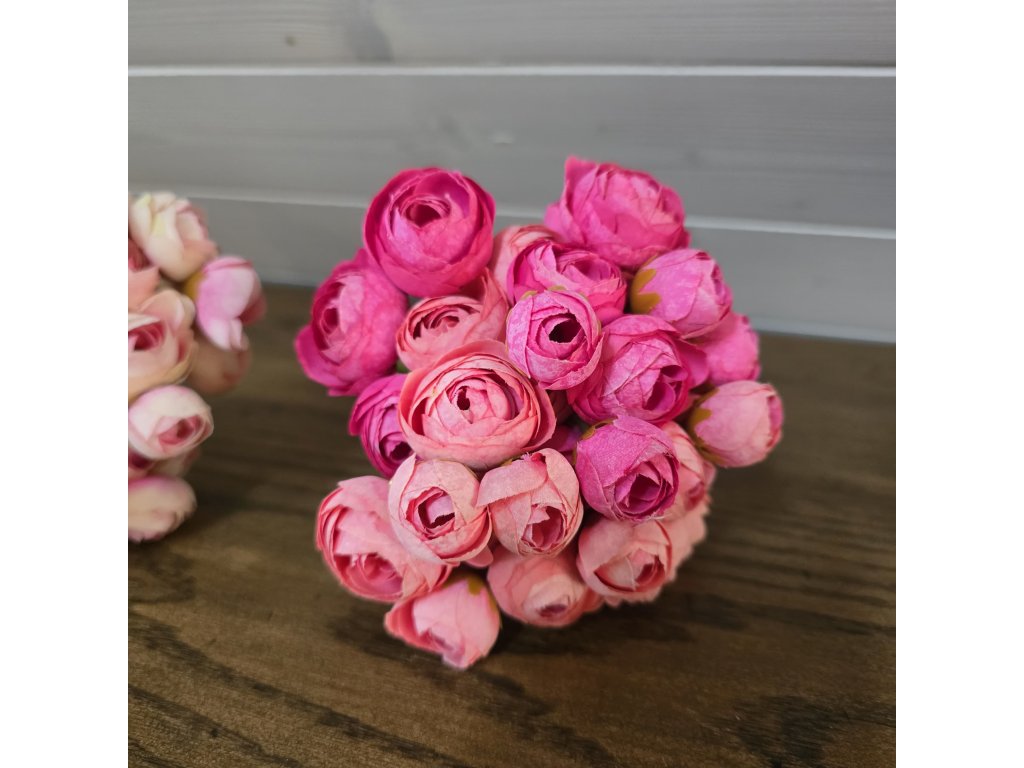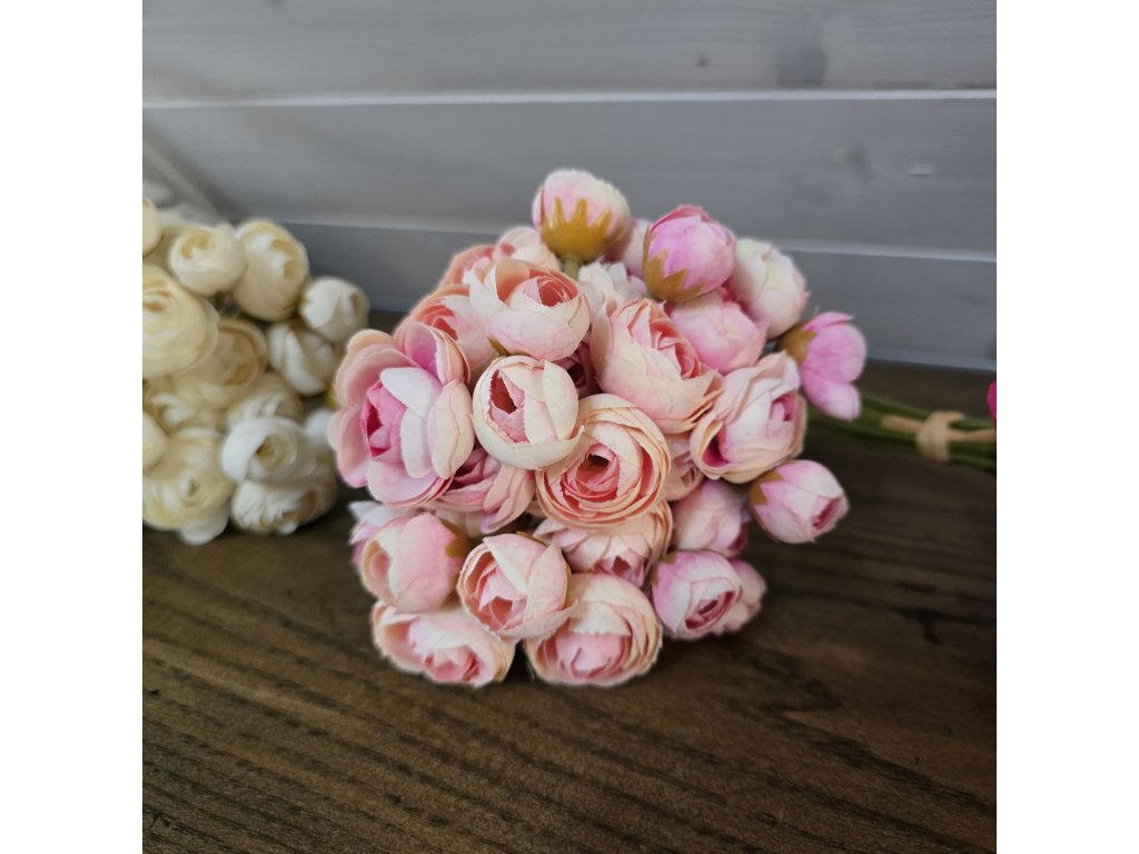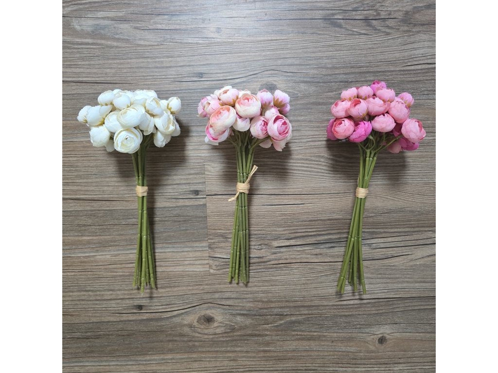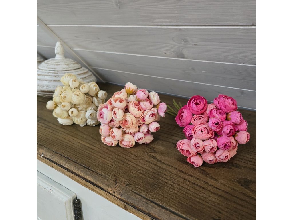 Kytice látkových Pryskyřníků. Délka 30cm, v pugetu je 36 květů.